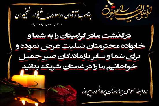 درگذشت مادرگرامیتان را به شما و خانواده محترمتان تسلیت عرض نموده و از پروردگار متعال طلب مغفرت و غفران واسعه الهی برای آن مرحومه و صبر جمیل برای بازماندگان داریم.