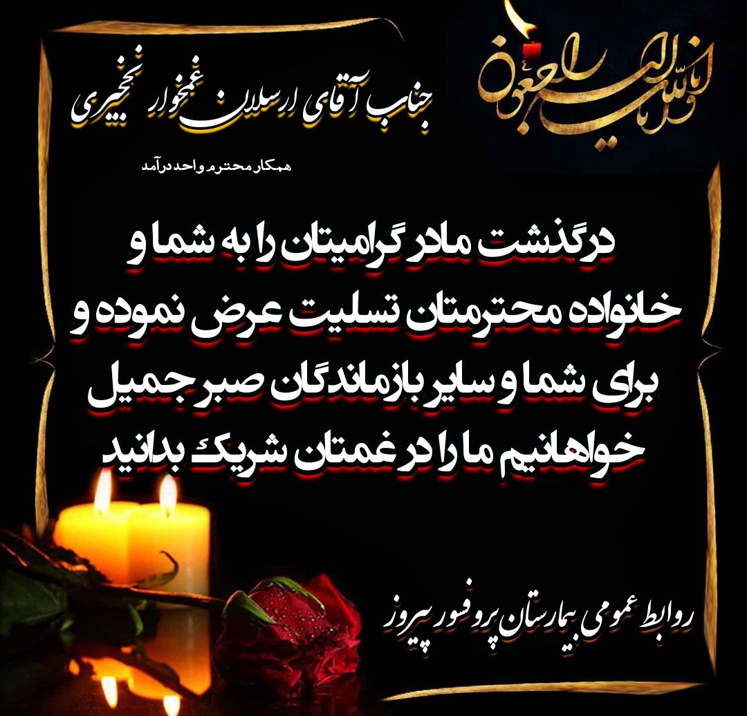 در پی درگذشت مادر همکار واحد درآمد، ریاست و مدیریت بیمارستان پیام تسلیتی صادر کردند.